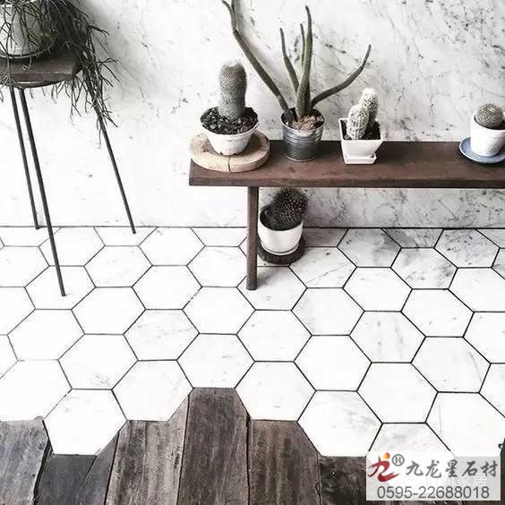 ↑六角形大理石紋地磚和木地板拼接,讓地面更有趣,做的時(shí)候要多留心工藝哦。