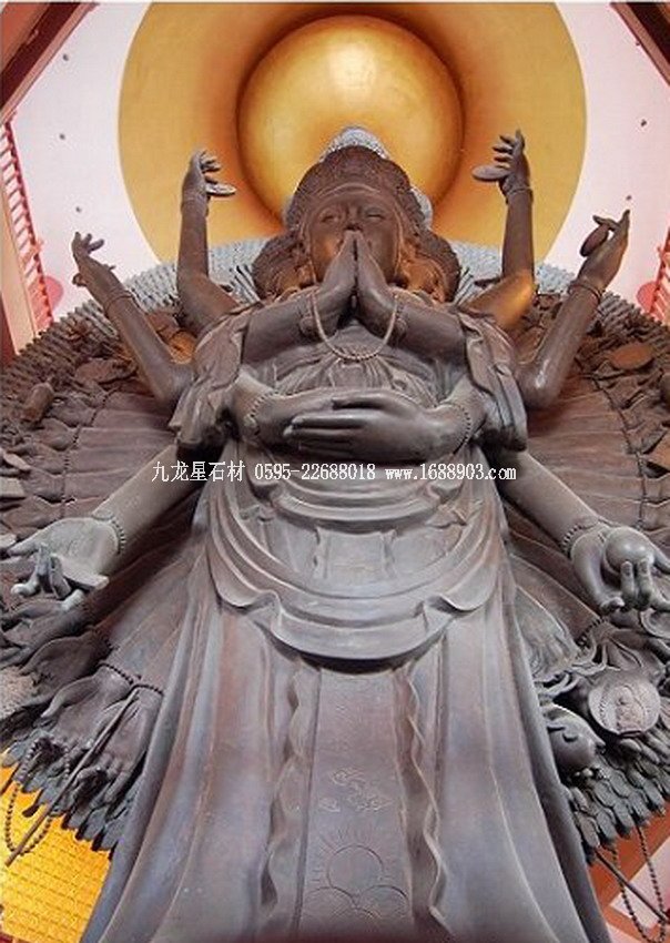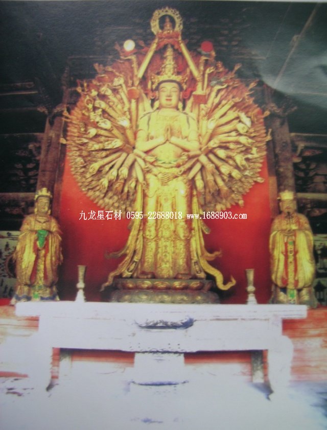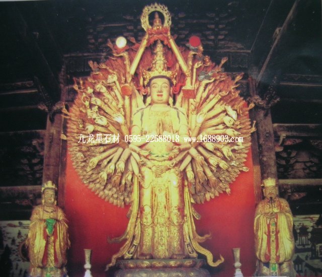 千手觀音是我國民間信仰的六大菩薩之一。千手觀音是阿彌陀佛的左脅侍,與阿彌陀佛、大勢(shì)至菩薩(阿彌陀佛的右脅侍)合稱為“西方三圣”。據(jù)佛教典籍記載,千手觀音菩薩的千手表示遍護(hù)眾生,千眼則表示遍觀世間。