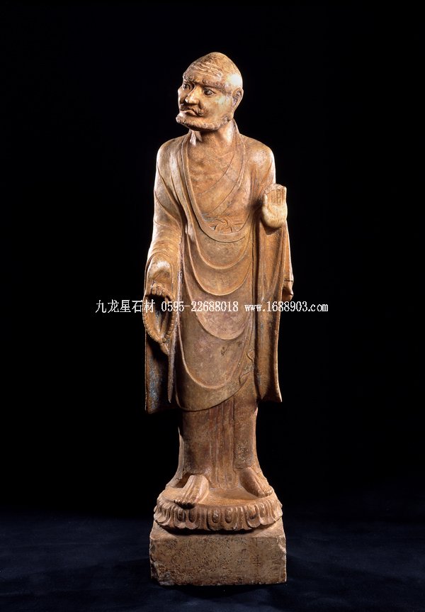 佛史上有十六、十八或五百羅漢之說(shuō),他們也是跟隨釋迦牟尼聽(tīng)法傳道的眾弟子,所以,羅漢造像多為世俗和尚們言行舉止的寫(xiě)照。館藏的金代羅漢像在相貌和形體上是一位惟妙惟肖的胡僧。羅漢內(nèi)穿僧祇支,外罩袈裟,衣裝的層次結(jié)構(gòu)刻畫(huà)得細(xì)致分明。衣質(zhì)輕薄,透出瘦削的體格,胸部突出的肋骨清晰可見(jiàn)。衣紋的曲直轉(zhuǎn)折既寫(xiě)實(shí)又富裝飾性,前面的一組平行弧線由上至下遞增,富有節(jié)奏感,和垂直的形體構(gòu)成和諧對(duì)比。羅漢的頭顱呈圓錐形高聳,象征已得盡智。臉相清癯,高鼻,深目,顴骨凸出,卷曲的眉毛、胡須栩栩如生。羅漢微微側(cè)頭,似乎正在神情專注地聆聽(tīng)著什么。造型設(shè)計(jì)抓住這種一剎那的動(dòng)感,給本來(lái)靜態(tài)的立像增添了許多生氣。羅漢像的背面也有寫(xiě)實(shí)的形體和衣紋描繪,吻合此像為三維空間之作的創(chuàng)意。這尊石像,雕工純熟精湛,人物形神皆備,實(shí)為宋金時(shí)代中國(guó)羅漢像的代表作。