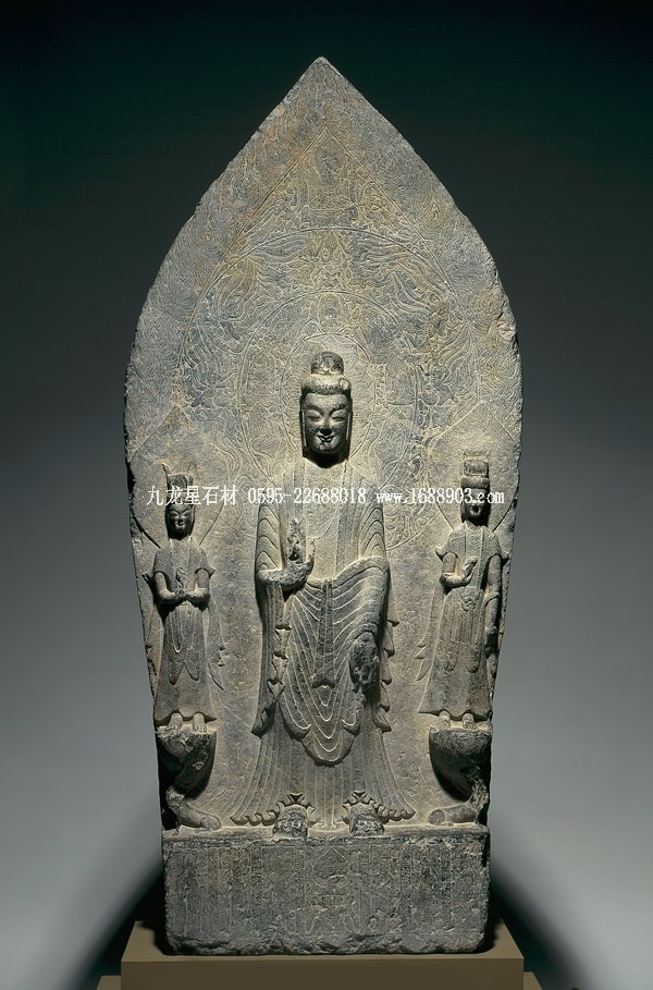 石碑正面雕一佛二菩薩,菩薩腳邊有護(hù)法獅子,現(xiàn)只剩殘?bào)w。佛和菩薩面相清瘦,身軀修長(zhǎng),頭部和手腳近似圓雕,佛裝則以高淺浮雕展示不同層次。如佛身上的漢化褒衣博帶式袈裟和衣裙腳部重疊衣褶的造型。他們身后是火焰形大背光,上面用減地陽(yáng)刻和陰刻手法由中心向外畫(huà)出五個(gè)裝飾圈。中心圈是佛的頭光,內(nèi)有蓮花瓣;旁圈里是過(guò)去七佛;再外圈有六身飛天環(huán)繞,上部有一人形神獸頂一香爐,飛天或持蓮苞、香熏和樂(lè)器,姿態(tài)飄逸清揚(yáng);在此圈的尖頭部分又畫(huà)出第四圈,內(nèi)含一佛像,禪定趺坐于蓮花寶座上,側(cè)脅兩個(gè)飛天;最外圈是飛動(dòng)的火焰圖案。