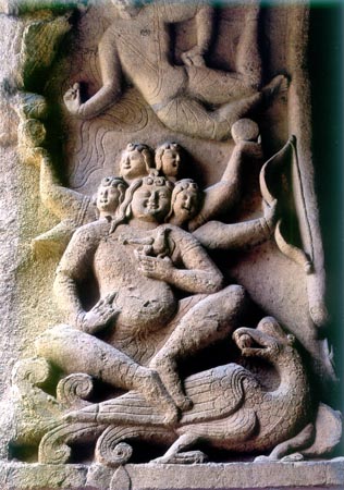 最饒有趣味的是第八窟拱門東側(cè)雕刻的摩醯首羅天和西側(cè)的鴻摩羅天,一個(gè)騎神牛三頭八臂,一個(gè)乘神鳥(niǎo)五頭六臂。這一組新奇神異的浮雕,不再是生命的寫實(shí),而是精神的寫意。游牧民族用審美的藝術(shù)形象折射生命現(xiàn)象中的“多頭多臂”,內(nèi)化為人類幻想生長(zhǎng)出更多的智慧頭腦和勇敢的手臂,去征服自然,以獲得自身生命的拓展與延伸。