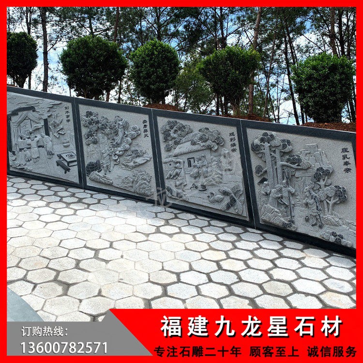 本公司做為此項目的承接方,從設(shè)計、雕刻、運輸、安裝施工一站式服務(wù),包含了涼亭、二十四孝浮雕,墓碑等整個工程。本套墓圍采用的優(yōu)質(zhì)的G654+青石,整個工程耗時三個多月,靠著過硬的產(chǎn)品質(zhì)量、細致的服務(wù)如期完成整套項目,深得客戶好評。